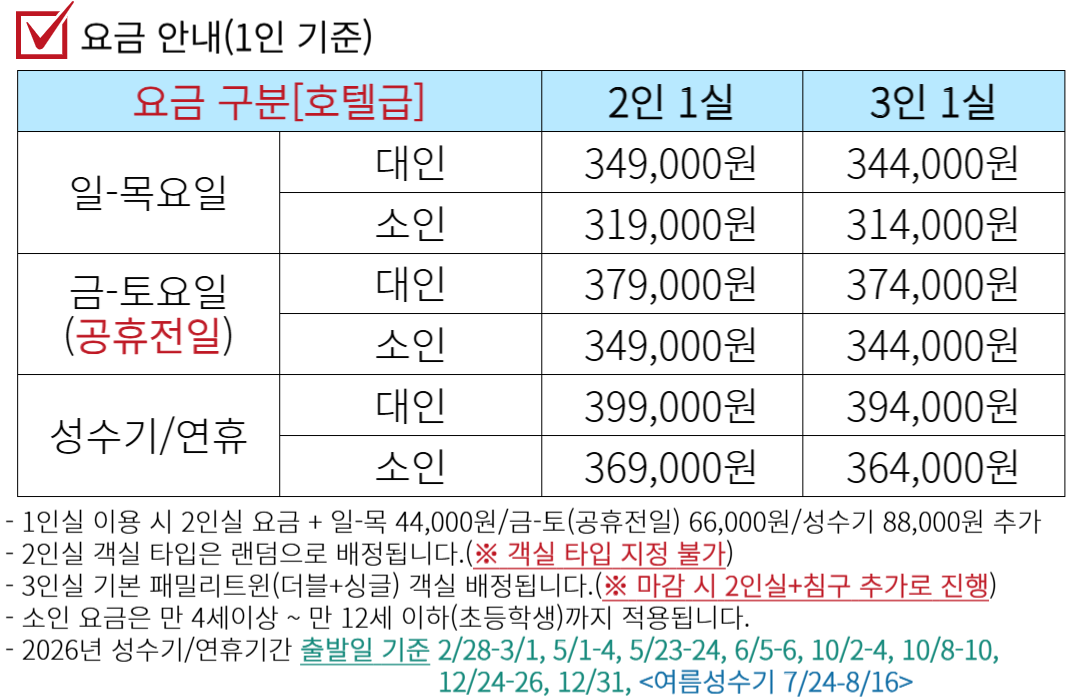- 예약 시 여행자 전원 <성함/생년월일/성별/휴대번호/거주지(시, 군단위)> 정보 제출이 필수입니다.