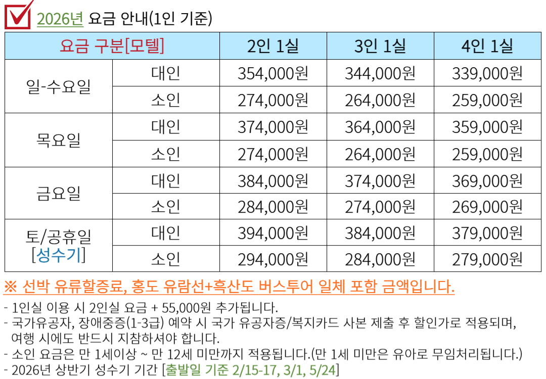 - 본 상품은 선박이용 일정으로 예약 시 여행자 전원 명단/생년월일/성별/연락처 제출 필수입니다.