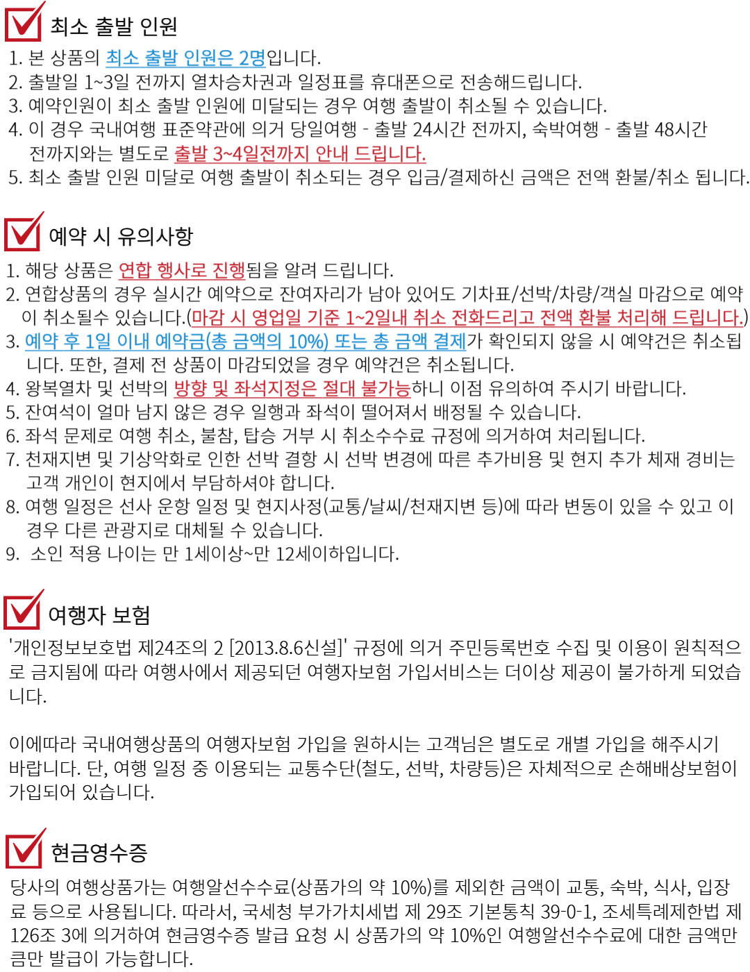 - 본 상품은 선박이용 일정으로 예약 시 여행자 전원 명단/생년월일/성별/연락처 제출 필수입니다.