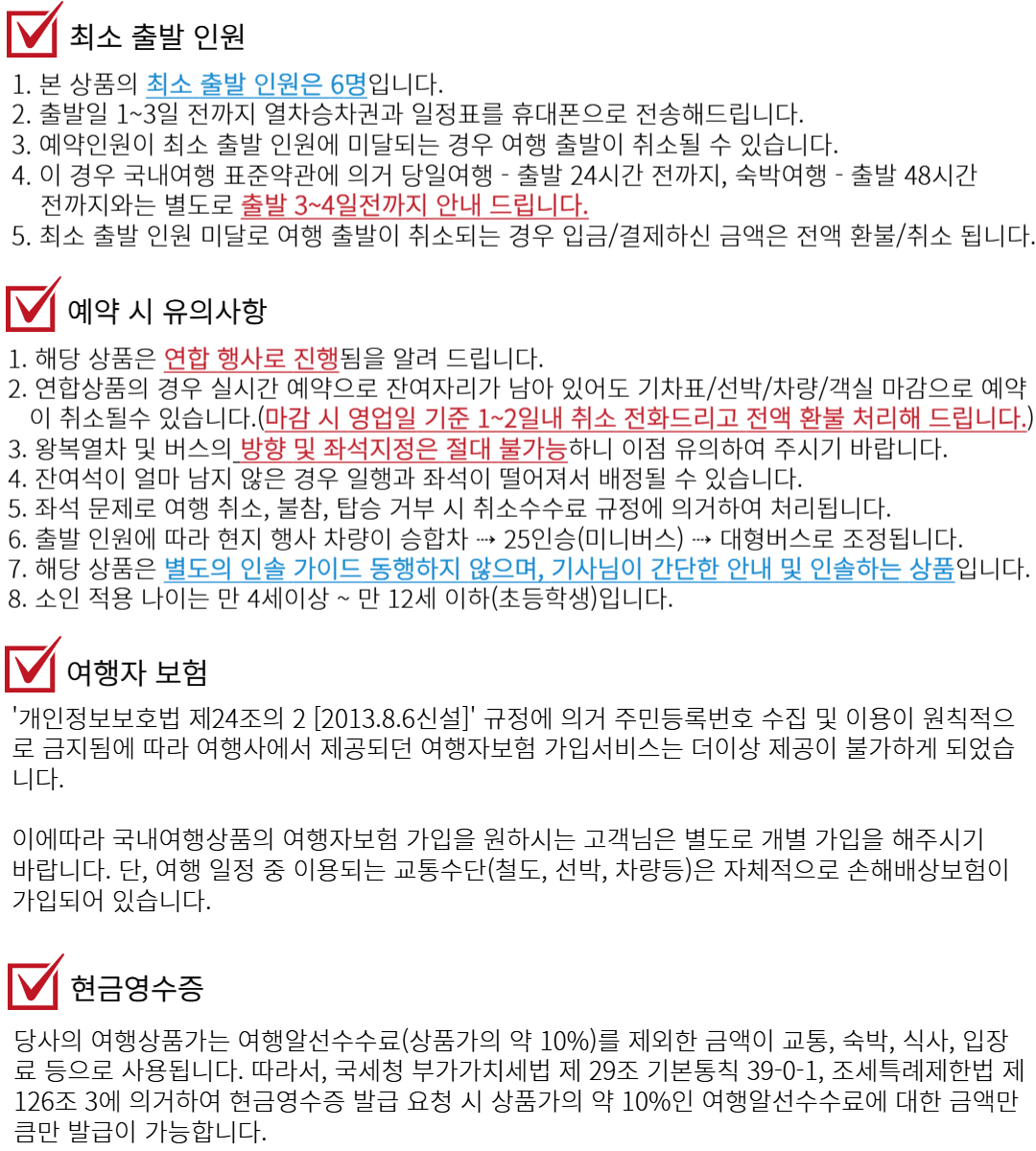 서울역 출발 [영등포 08:23-수원 08:46] ※ 가는 열차는 아래 열차로 변경될 수 있습니다. ▶ KTX #205[진주행] 서울역 08:23-광명 08:42-오송 09:10-대전역 09:27 도착 ※ 열차 시간은 선택 불가하며, 출발 1~3일 전까지 티켓과 일정표를 전송해 드립니다. |