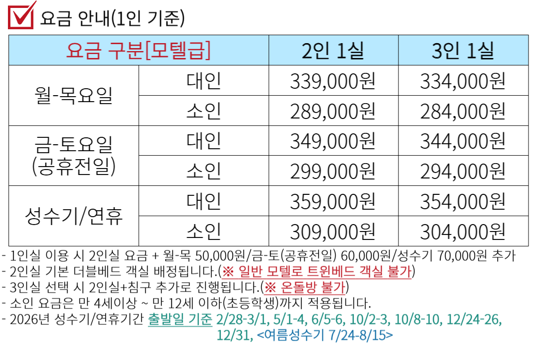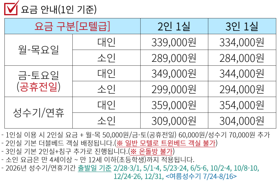 여름성수기 기간[7월 26일(토) - 8월 16일(토)]에는 주중/주말 관계없이 성수기 요금 적용됩니다.