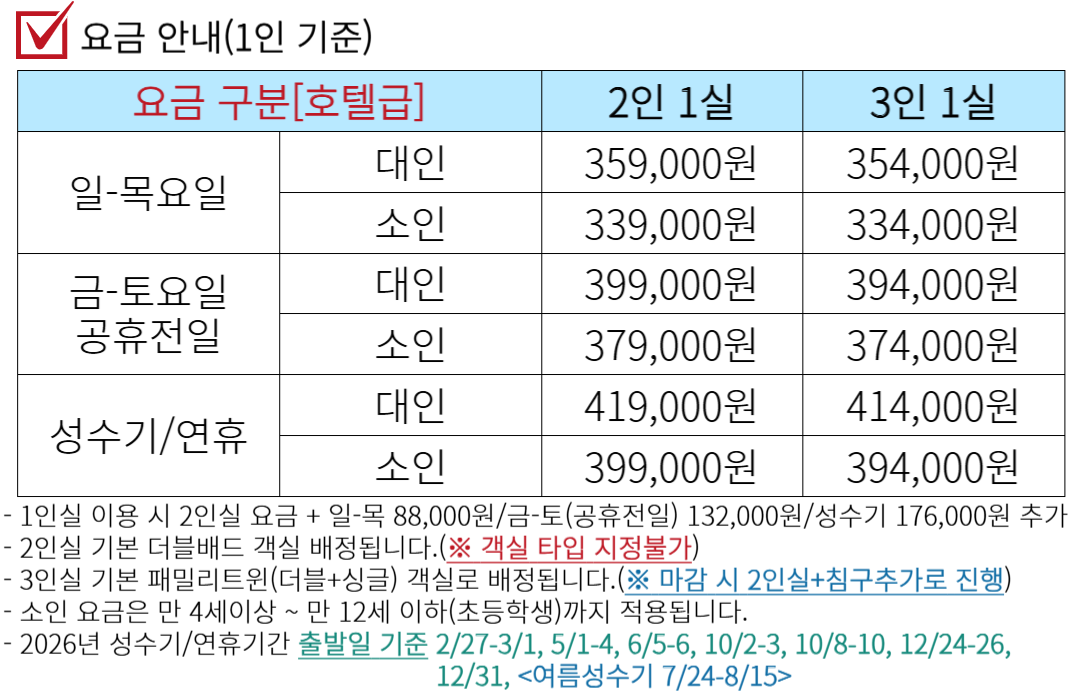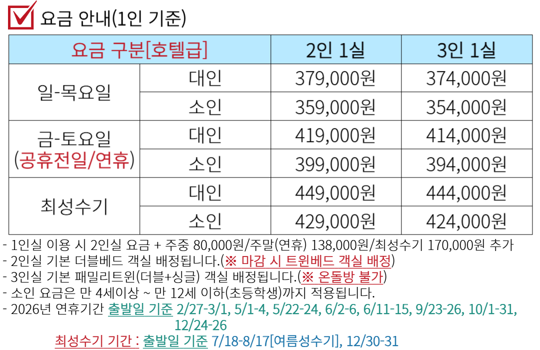 - 일정 중 관광지 내 단체사진 촬영이 진행되며, 예약 시 여행자 전원 <성함/휴대전화/거주지(동까지) 정보 제출>이 필수입니다.