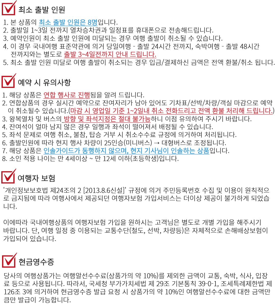 용산역 출발 [광명 09:36-오송 10:06] ※ 가는 열차는 아래 열차로 변경될 수 있습니다. ▶ KTX #407[목포행] 용산역 07:47-광명 08:05-광주송정 09:41 ▶ KTX #409[목포행] 용산역 08:20-천안아산 08:55-오송 09:07-광주송정 10:12 ※ 열차 시간은 선택 불가하며, 출발 1~3일 전까지 티켓과 일정표를 전송해 드립니다. |