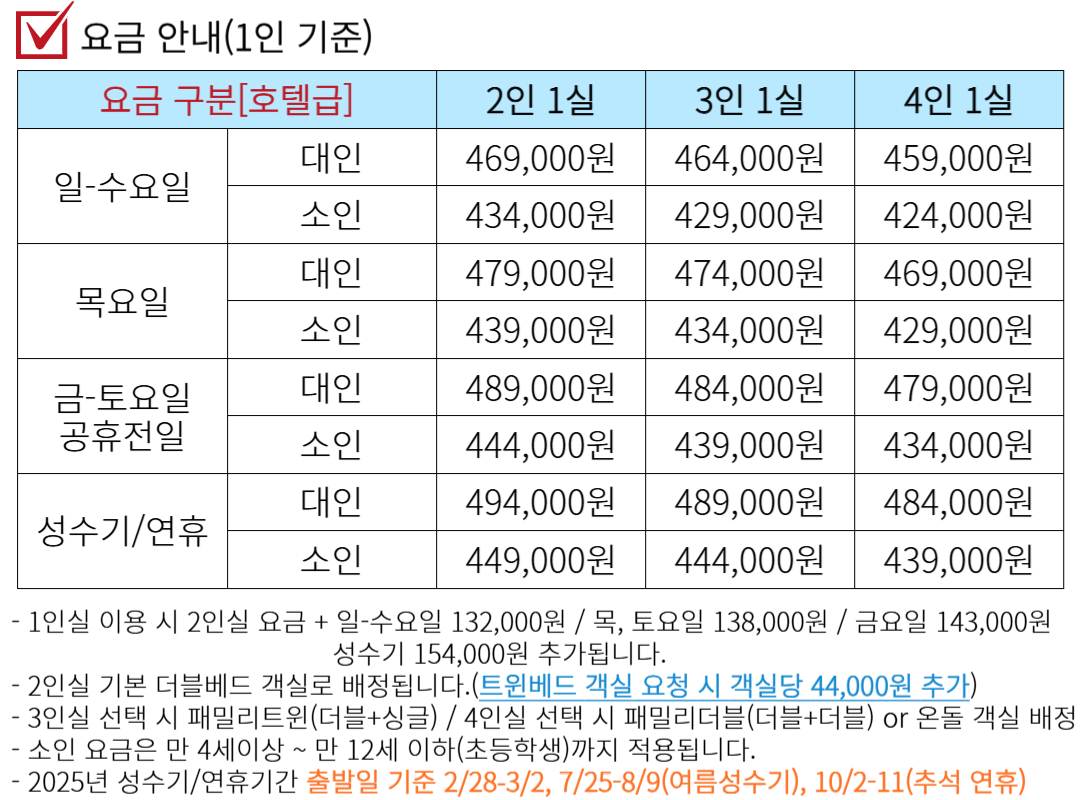 숙소 도착 후 객실 배정 및 휴식 ♣ 숙소 : 광양 락희호텔 또는 동급호텔 ♣ 객실 타입 - 2인실 (더블침대) / 3인실 (더블침대+침구추가) - 4인실 (더블침대+싱글침대+침구1인) 기본 객실로 진행되오니 유의바랍니다. - 인실별로 객실 층수가 각각 다릅니다. (예: 5명 예약 시 2인실, 3인실 → 층수 다름) ※ 2인실 트윈베드 요청 시 객실당 44,000원 추가 요금이 발생됩니다.(객실 현황 확인 후 확정) |