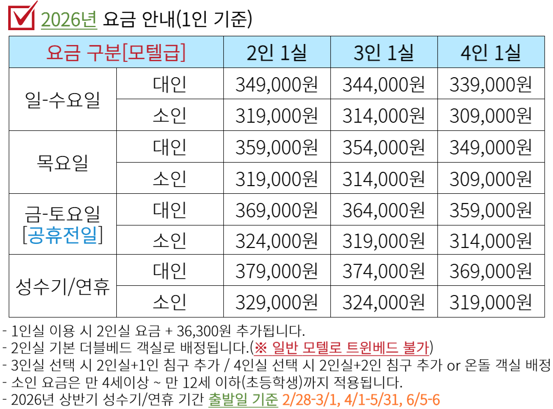 ▶ 4/1(수) - 5/31(일) 기간 출발일은 주중/주말 구분없이 성수기 요금 적용됩니다.